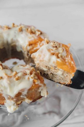 It’s made in a bundt pan, which is a circular pan with a central hole to promote even cooking and also give you a gorgeous-looking cake.