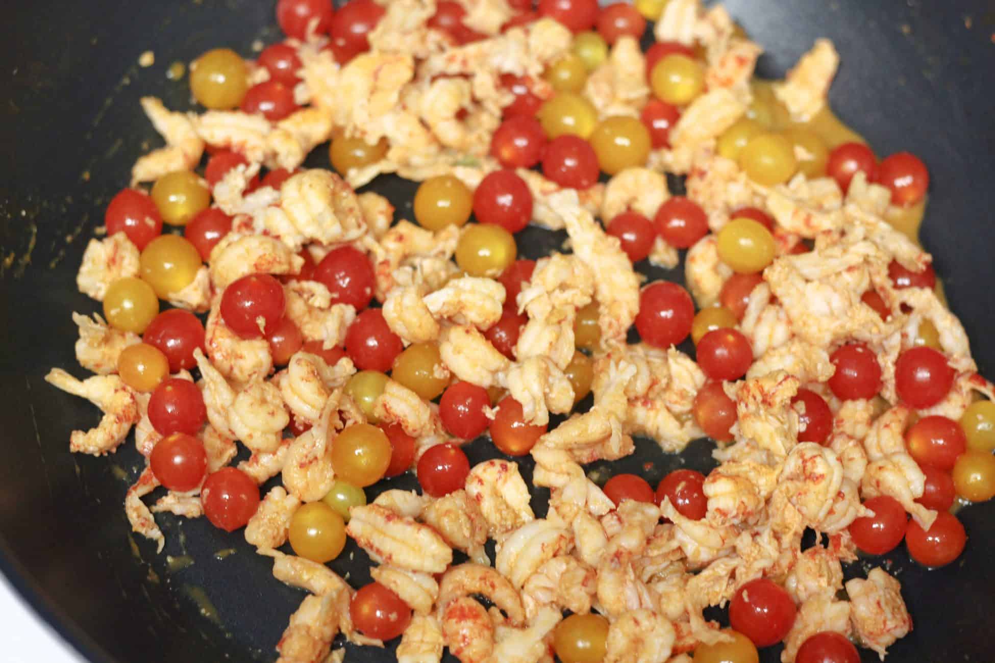 Step 6. Add in the tomatoes, crawfish, and cajun seasonings. Stir to blend. Saute for 1 minute. Remove from heat. Set aside.
