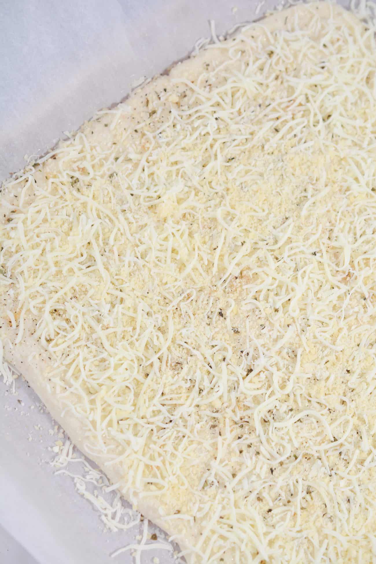 - Add the mozzarella cheese and parmesan cheese to the dough.