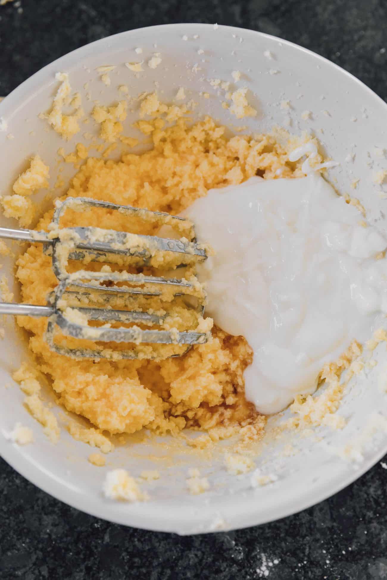 - In a large bowl, add butter and beat until creamy. Add the sugar to the butter and continue to beat until light and fluffy. One at a time, beat in the eggs until well combined. Add in yogurt and vanilla and beat until all the ingredients are incorporated and the mixture is smooth.