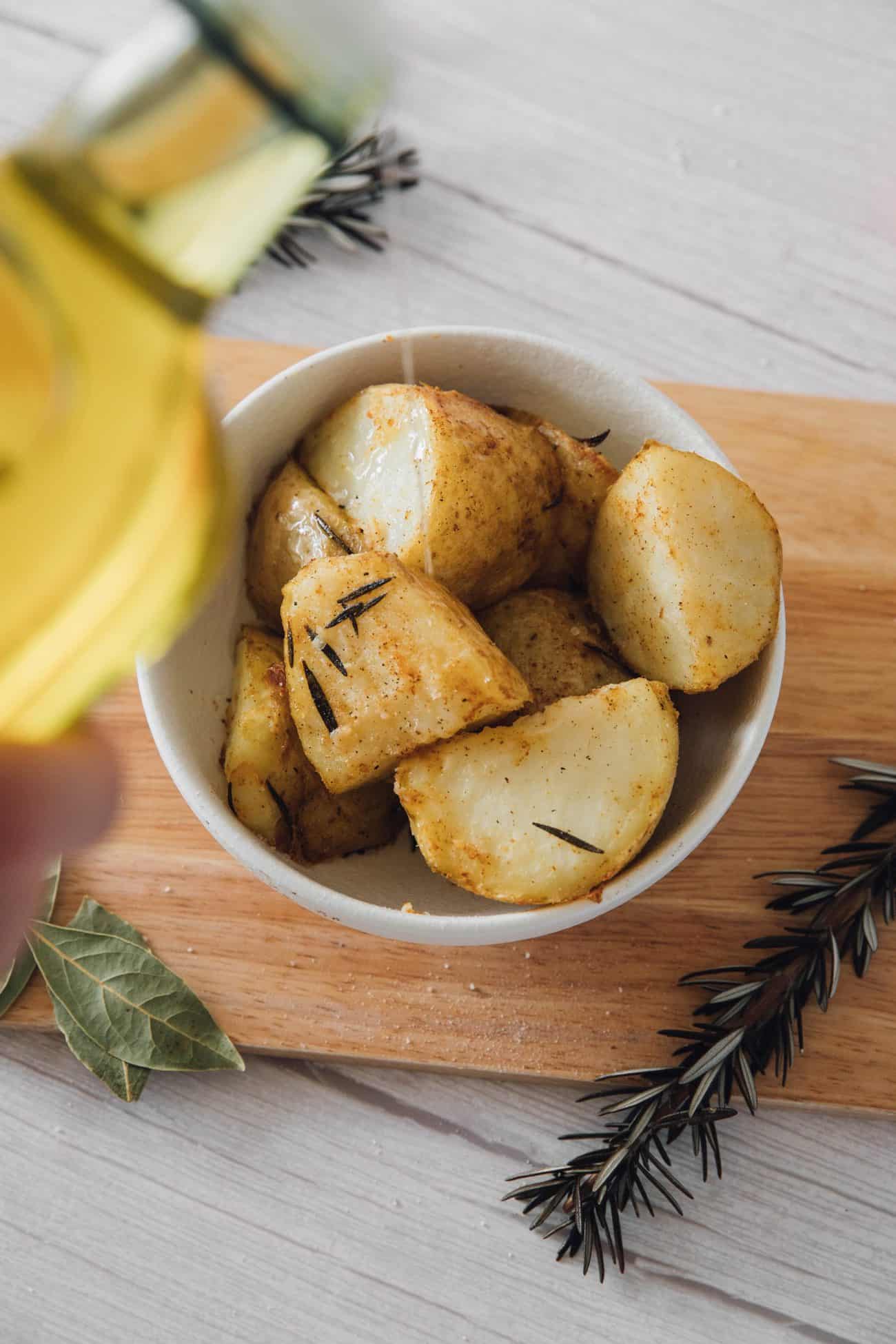 - Add the potatoes to a large mixing bowl and drizzle with 2 Tbsp of the olive oil.