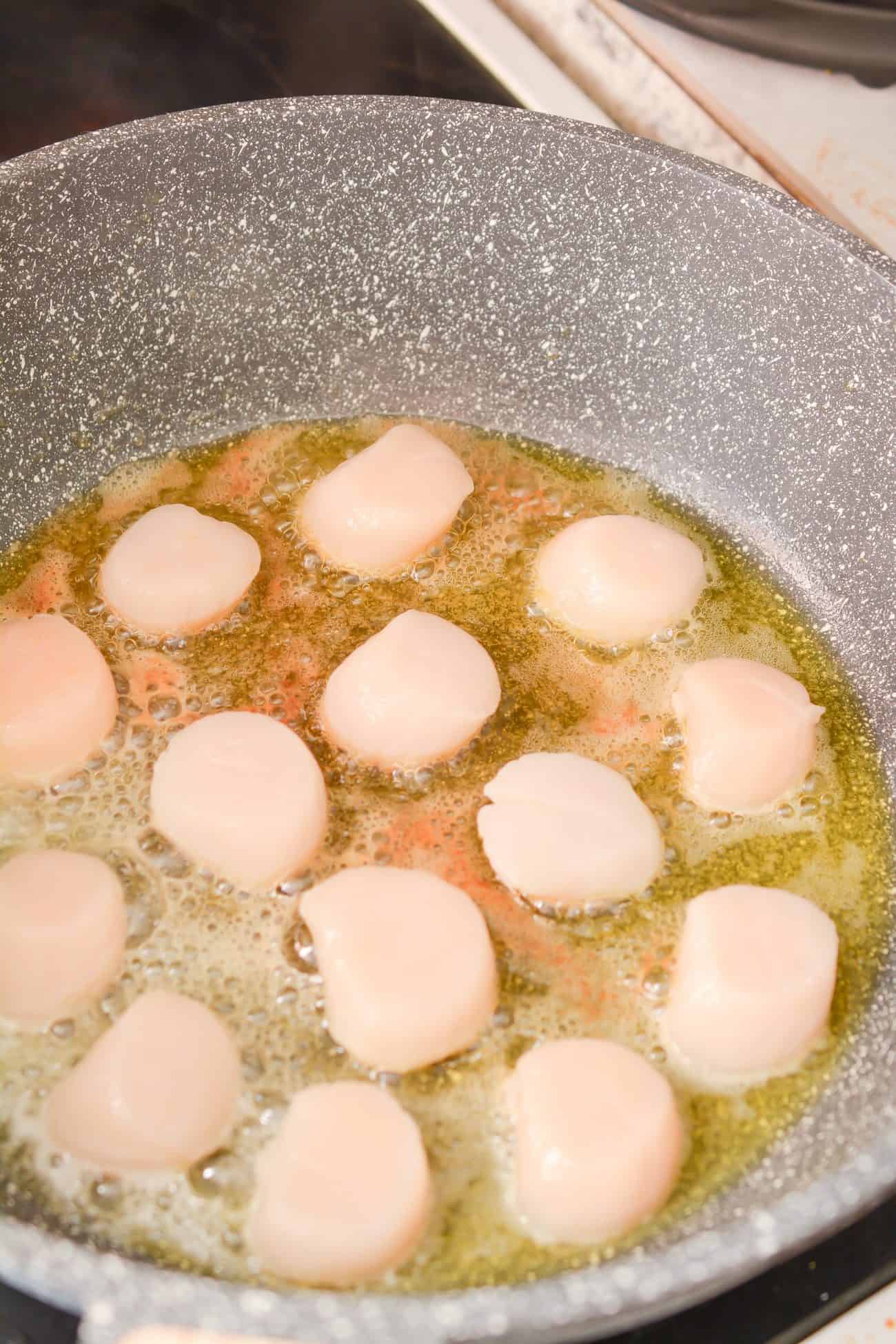 - Add the minced garlic to the skillet, turn the scallops over, and saute for a minute and a half longer.