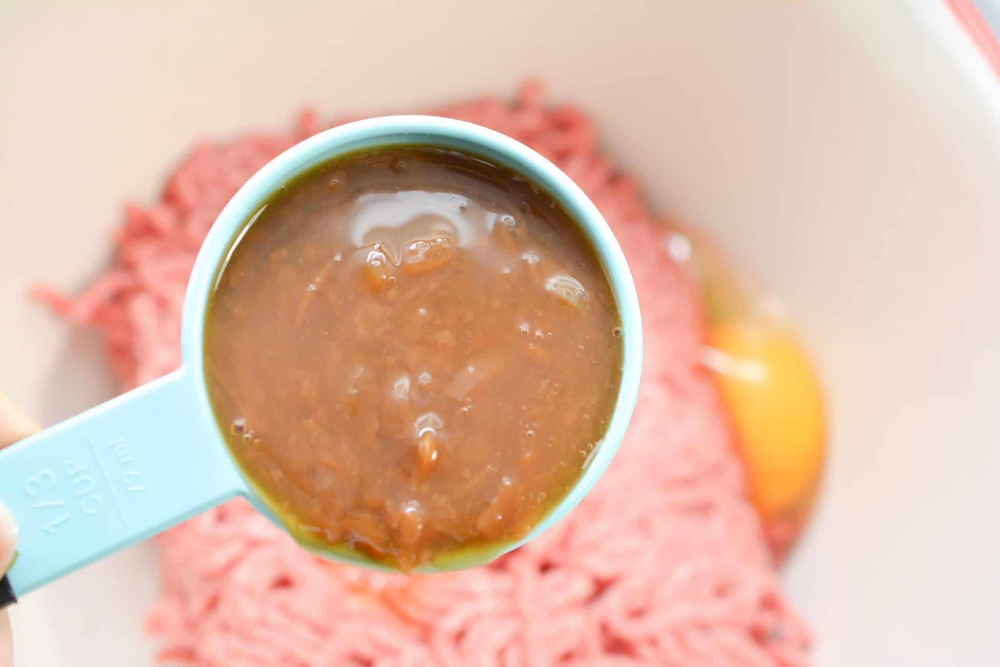 - In a large mixing bowl, combine the meat, ⅓ cup of the French onion soup, breadcrumbs, egg, and salt and pepper. Knead with your hands until combined well.
